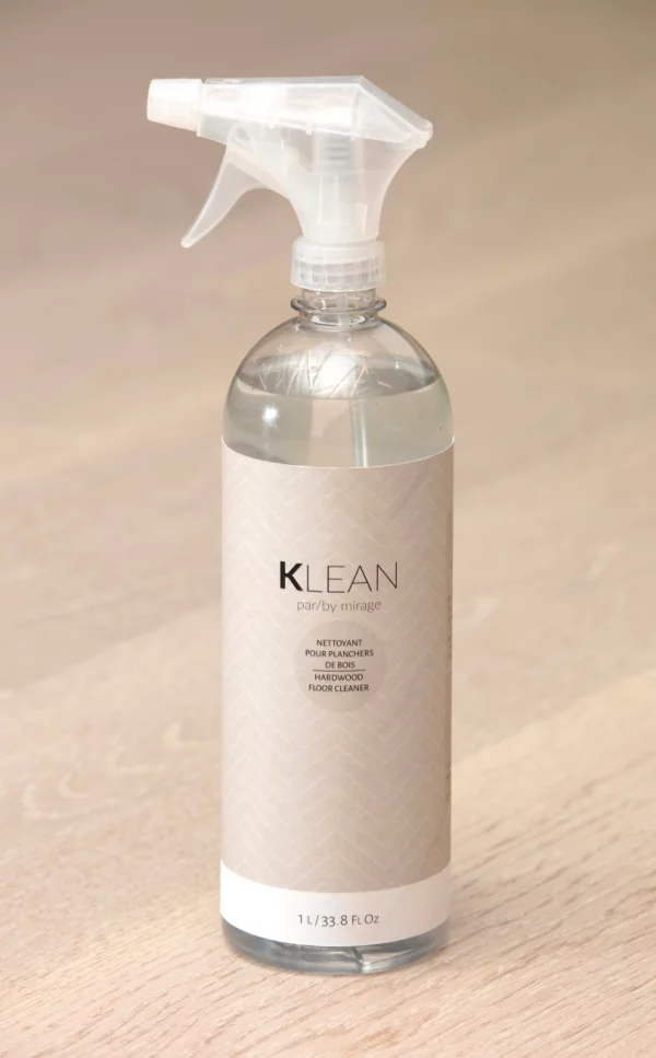 Les produits KLEAN par mirage sont conçus pour rendre votre plancher de bois franc Mirage propre en quelques minutes. Évitez de verser une quantité excessive de nettoyant ou de tout autre liquide sur la surface de votre plancher; le liquide pourrait s'infiltrer et endommager le bois.