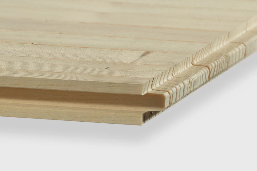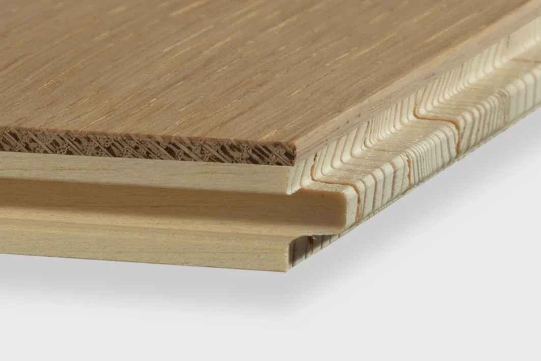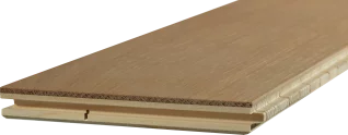 Le centre en lamelles de bois de 9 mm est composé de matériaux provenant de sources locales, des essences à croissance rapide, qui réduisent l’empreinte écologique sans compromettre la qualité. Cette couche centrale est constituée de fines lamelles disposées côte à côte sur un placage en bois de haute qualité d’une épaisseur de 2 mm pour assurer la rigidité maximale des planches et prévenir toute déformation. Ces lamelles, placées perpendiculairement à la fibre du bois de la couche supérieure, renforcent la structure, limitant ainsi les effets des variations d’humidité, et la munissent d’une stabilité optimale.