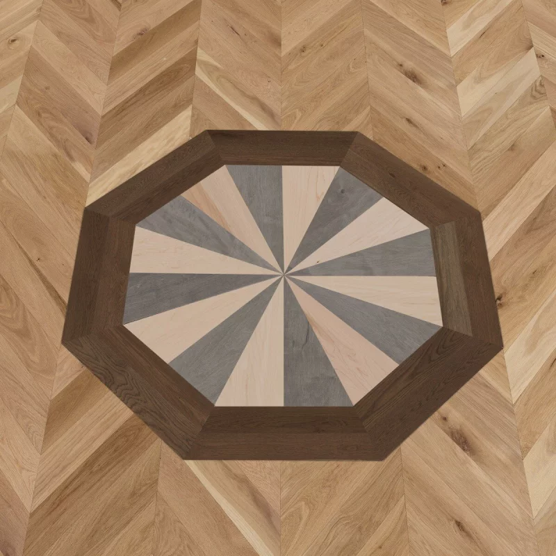 Les planchers de bois franc Chevron peuvent être magnifiquement encadrés par des planches Linéaire ou utilisés en plein motif ou de mur à mur. L’ajout d’insertions colorées dans un motif Chevron met en valeur des zones d’intérêt, comme le centre d’une entrée. De plus, l’alternance des couleurs et le mélange de matériaux, tels que les tuiles, apportent une touche ludique, faisant de ce type de plancher un choix audacieux et stylé qui séduit l’œil.