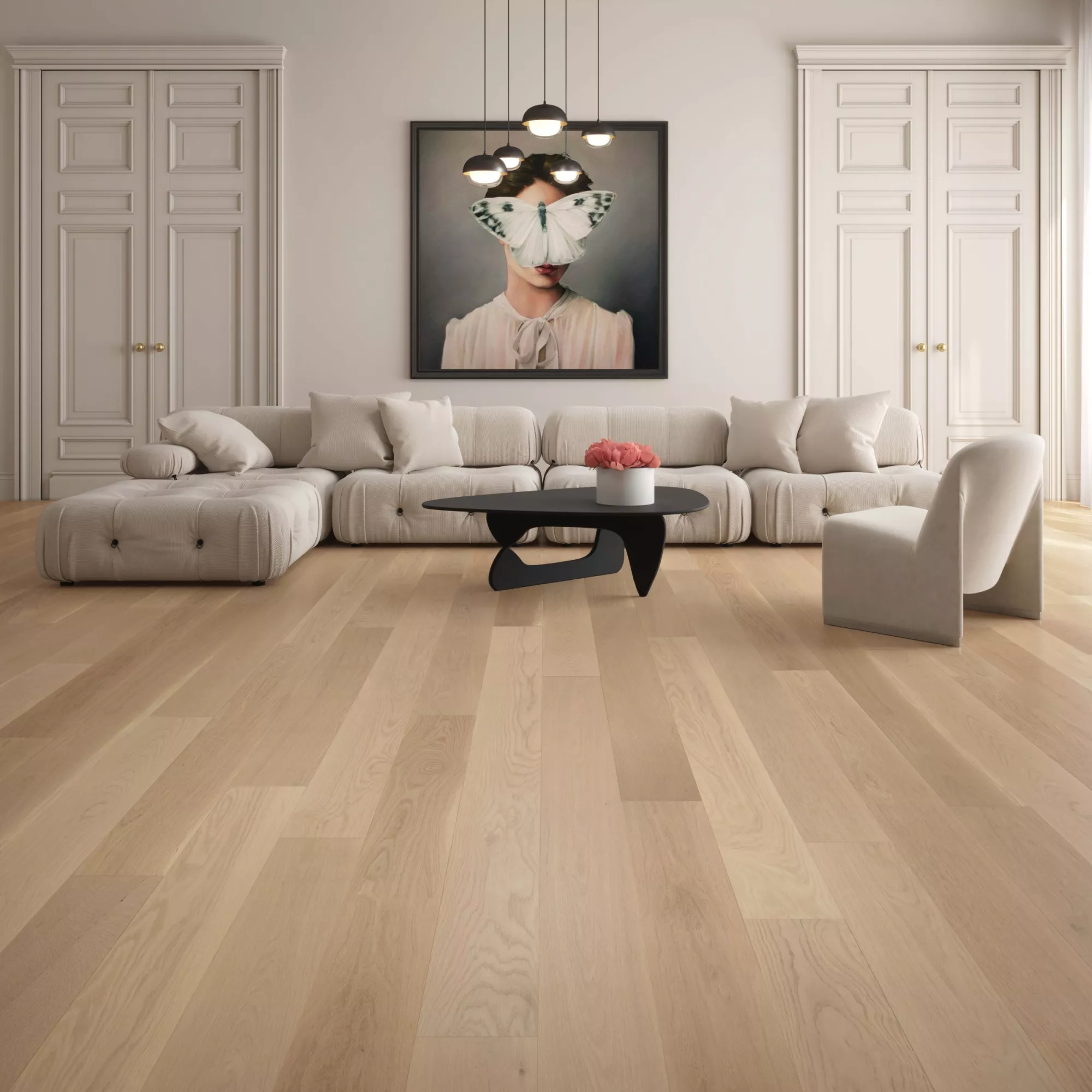 Rehaussez l’élégance de votre design d’intérieur avec le plancher de bois franc Chêne blanc Ingrid Brossé. Sa teinte neutre semblable au jute, avec des nuances de blonds, bruns et havane, confère une profondeur et un caractère uniques à une pièce. Associée à des éléments de design à contraste fort ou subtil, Ingrid est un excellent choix pour les salons audacieux.