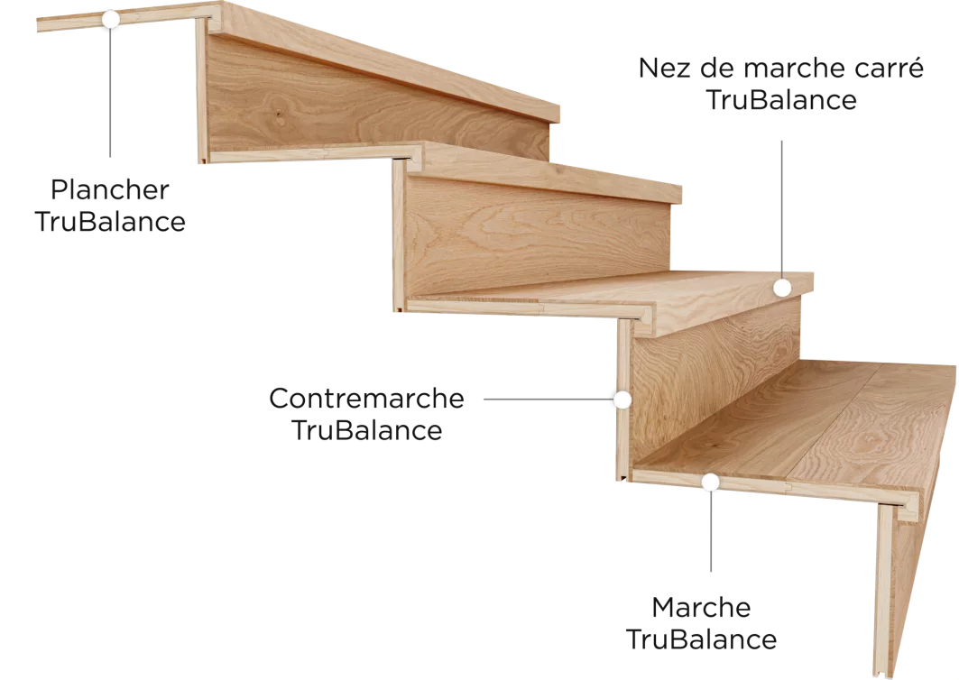Pour les marches suivantes, nous recommandons d’utiliser les nez de marche carrés TruBalance en combinaison avec les planches pour marche et contremarche TruBalance. Cela simplifie le processus d’installation, quel que soit le type de plancher choisi pour le bas de l’escalier.