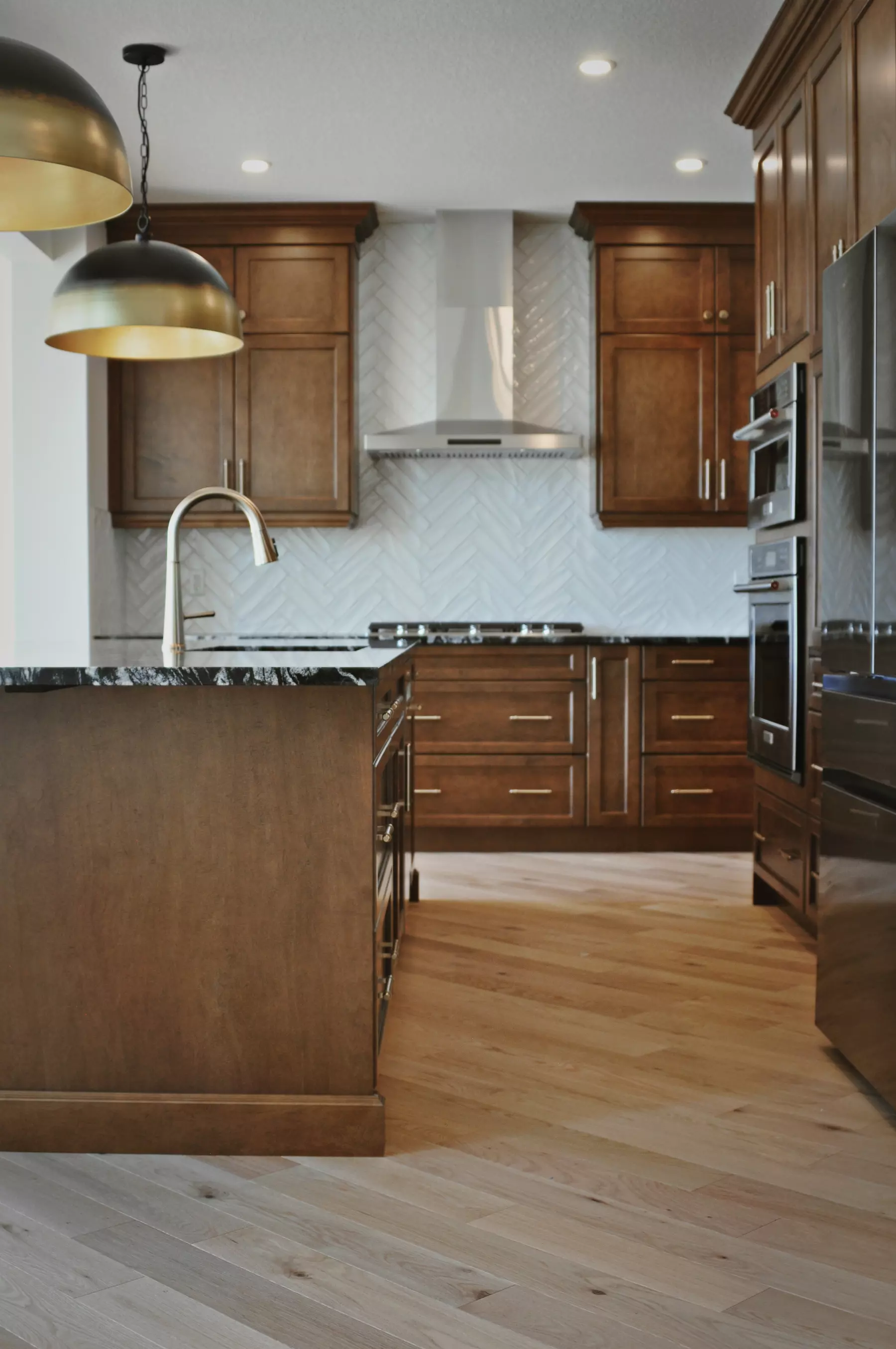 Cette maison raffinée de Calgary, Alberta, met en vedette le plancher Chêne rouge Laguna Caractère Brossé, installé en diagonale pour créer un effet visuel remarquable. Cette pose distinctive apporte mouvement et personnalité aux aires communes, de la cuisine à l’escalier et au salon lumineux.