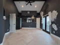 Dans cette suite principale remarquable, le plancher de bois franc Chêne blanc Bubble Bath Exclusive Brossé est installé en motif Herringbone de 5 pouces, apportant rythme et symétrie à la pièce. Sa teinte pâle aux nuances de grège crémeux procure un contraste élégant aux murs foncés, apportant une géométrie équilibrée, moderne et intemporelle.