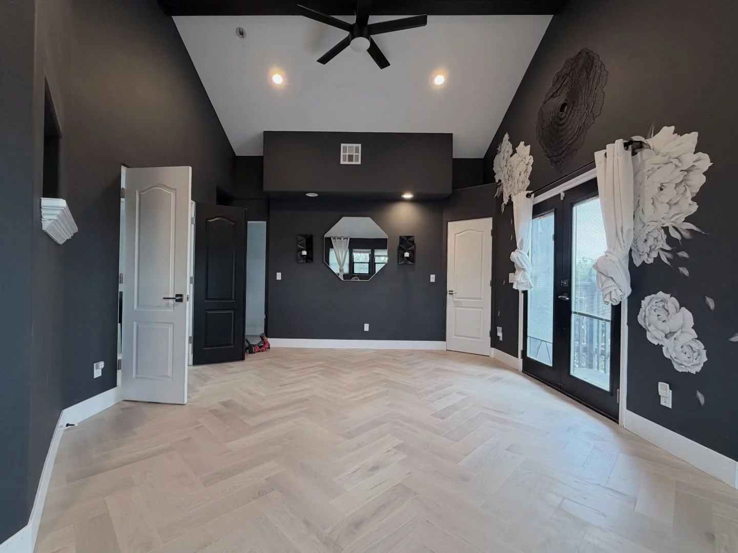 Réalisé par Van Briggle Floors, ce projet démontre comment un plancher de bois franc Herringbone en chêne blanc peut transformer une chambre en espace unique, où chaleur, texture et élégance cohabitent avec naturel.