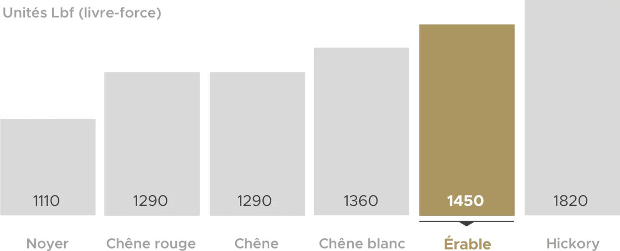 Durable et écologique, l’Érable est un bois franc à croissance rapide provenant des forêts du Nord-Est des États-Unis et de l’Est du Canada. Sa robustesse en fait un choix judicieux pour les espaces à fort passage, des salons aux salles à manger, ou à forte circulation comme les gymnases et les salles de quilles. Avec une dureté Janka de 1450, l’Érable résiste aux rigueurs du quotidien, parfait pour les foyers actifs, en particulier ceux avec de jeunes enfants.